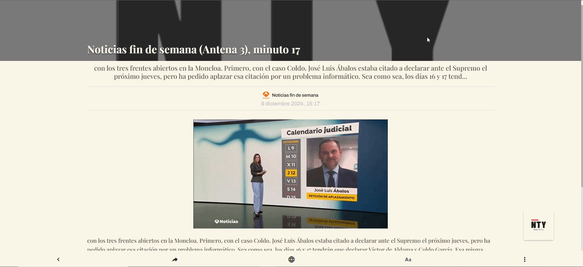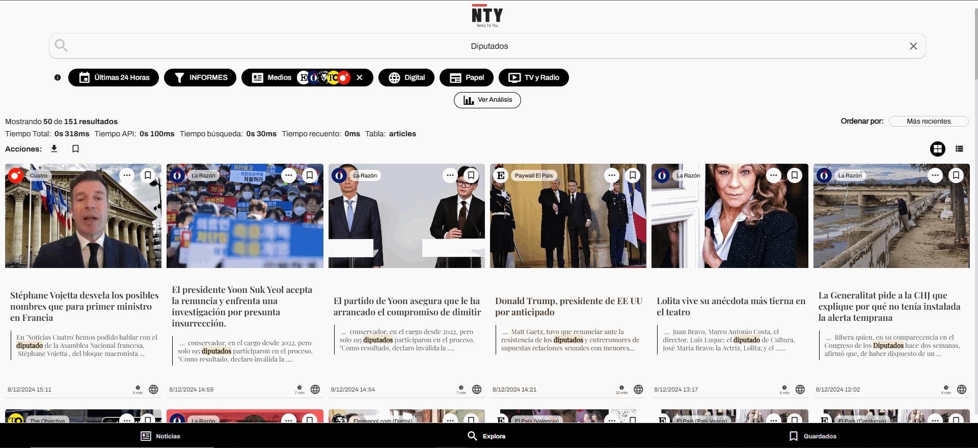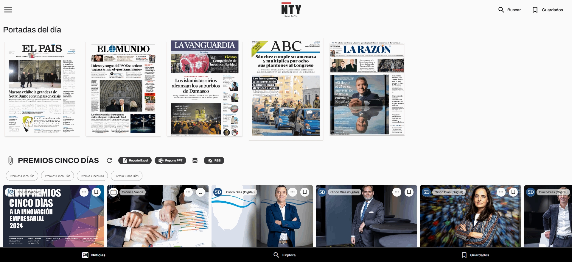News To You es un sistema de clipping de prensa completo. Capta fuentes de vídeo, audio, papel y formatos digitales, los auna en una plataforma agrupados según los intereses del cliente en base al contenido de los mismos.